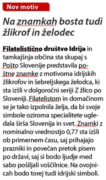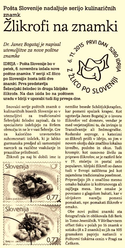 06.11.2015 - Članek v Idrijskih novicah z naslovom: Žlikrofi na znamki