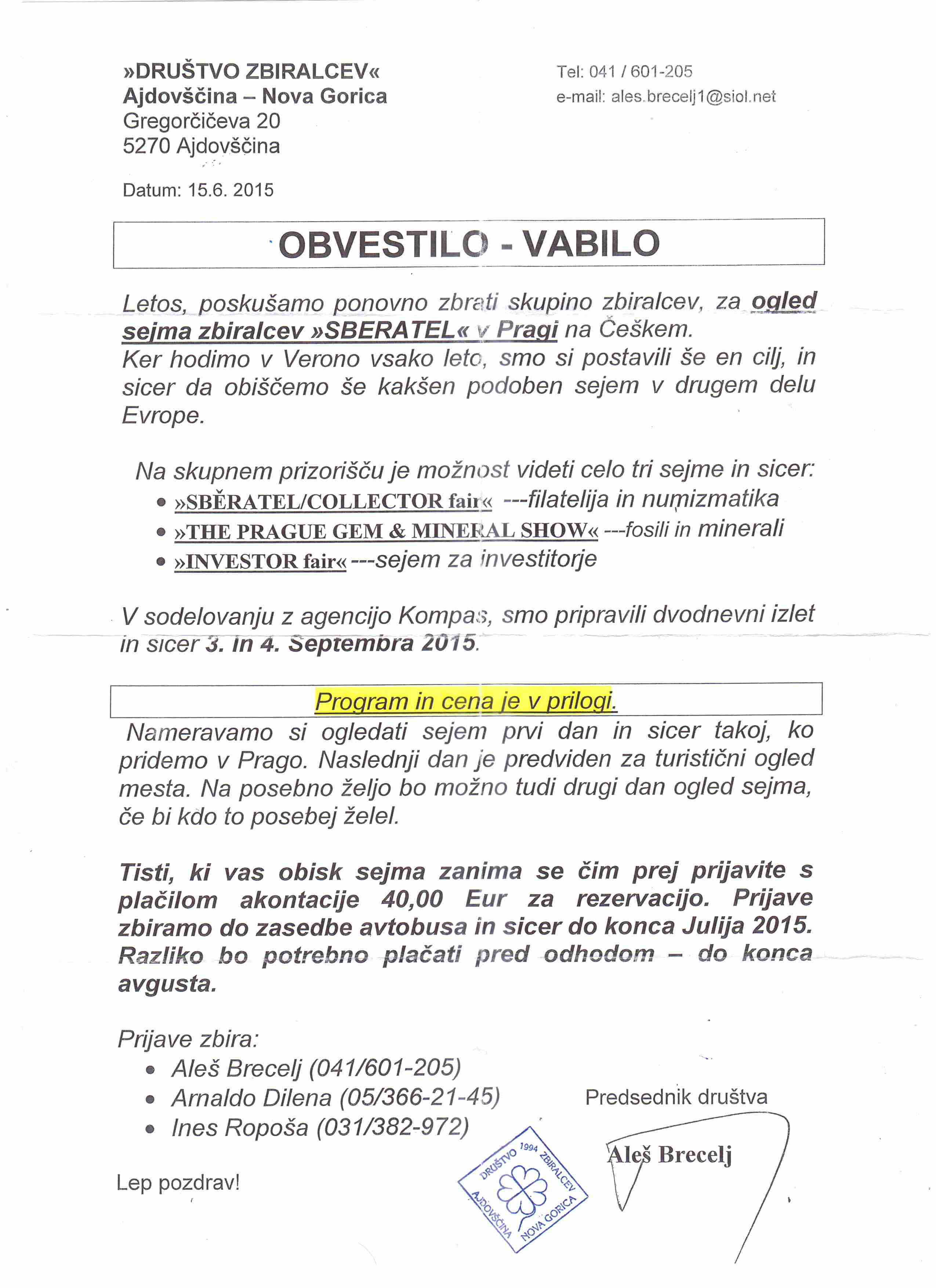 Društvo zbiralcev Ajdovščina - Nova Gorica  vabi, da se jim pridružimo na ogledu sejma Sberatel/Collector.  Izlet bo 3. in 4. septembra 2015. Na istem prizorišču si bo mogoče ogledati  3 sejme: poleg sejma filatelije in numizmatike bo še sejem mineralov in fosilov ter sejem za investitorje.  Prvi dan bo namenjen ogledu sejmov, drugi dan pa ogledu Prage ter vrnitvi domov. Cena tega dvodnevnega izleta je 144€. Več o izletu si lahko preberete na Vabilu in Prospektu. Interesenti naj se javijo Vojkotu Rejcu. Akontacija je 40€.